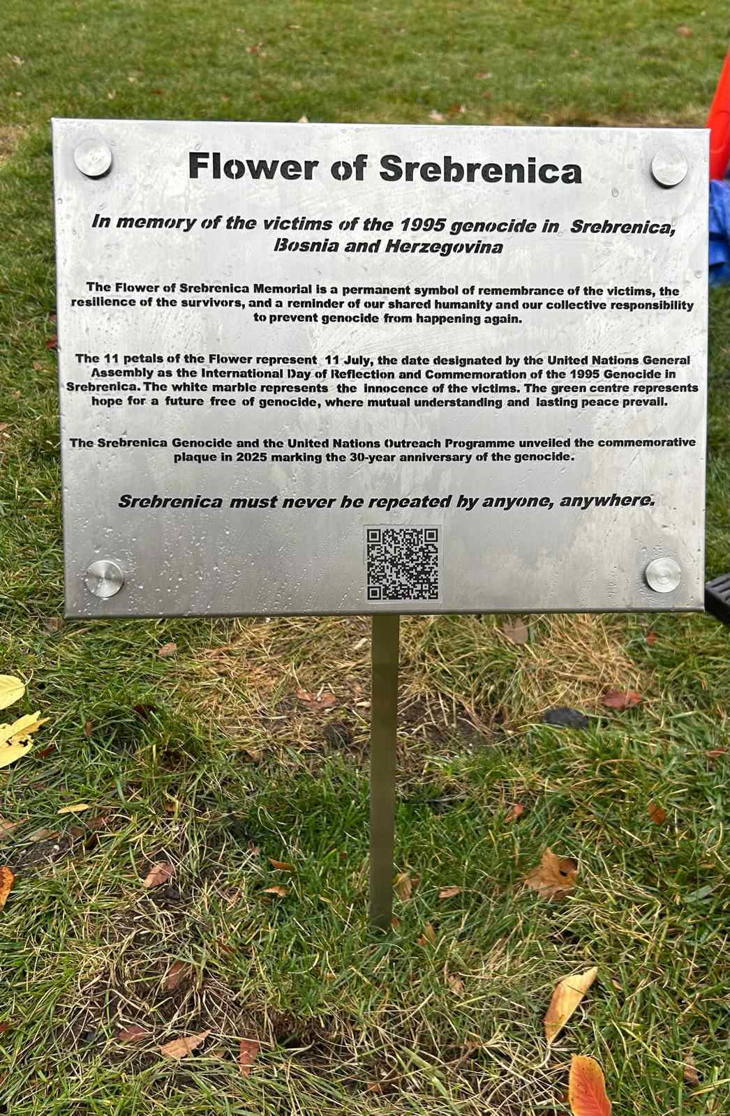 Uz spomenik je postavljen QR kod koji vodi na zvaničnu UN stranicu o genocidu u Srebrenici, digitalni arhiv koji sadrži hronologiju događaja, sudske presude i svjedočanstva preživjelih. Tabla pored spomenika na šest mjesta spominje riječ genocid, naglašavajući važnost edukacije i podizanja svijesti.