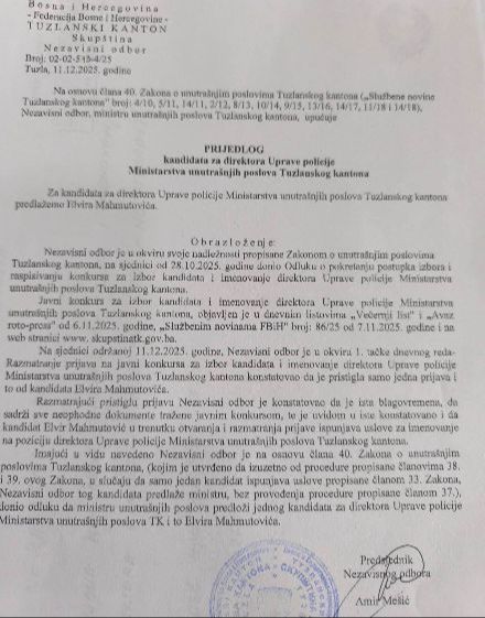 S obzirom na to da je riječ o jedinom kandidatu koji ispunjava propisane uslove, Nezavisni odbor je odlučio da bez provođenja dodatne procedure ministru unutrašnjih poslova predloži Elvira Mahmutovića za direktora Uprave policije MUP-a TK.