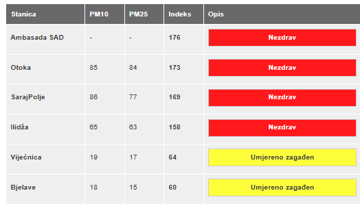 Iako je zrak nešto manje zagađen nego prethodnih dana, indeks kvaliteta zraka i dalje pokazuje vrijednosti u kategoriji nezdravog – jutros u 8 sati iznosio je 176.