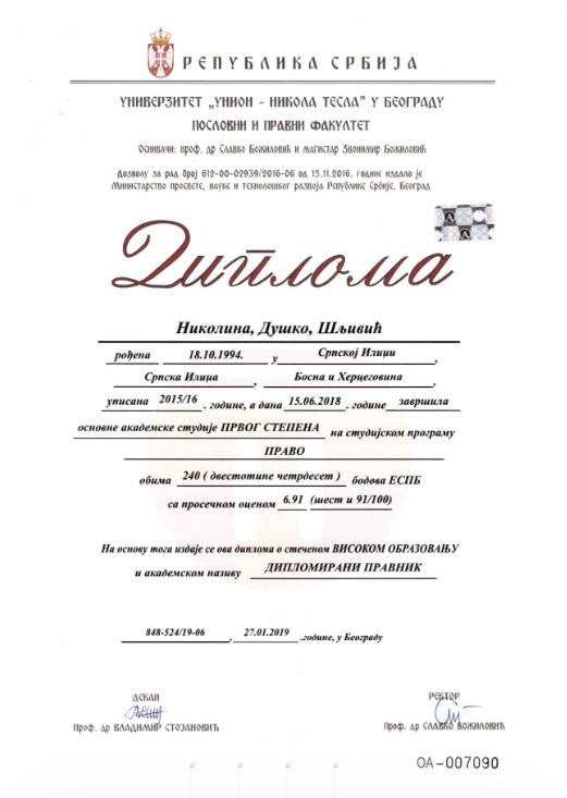 Zbog potencijalnog izvrtanja i ove informacije, napominje da je Univerzitet u periodu od njenog diplomiranja do danas promijenio naziv i da danas posluje kao Univerzitet MB, koji je pravni sljednik Univerziteta "Union - Nikola Tesla", uz puni kontinuitet prava, obaveza i važenja diploma, zbog čega je navedeni Univerzitet i izdavač priložene potvrde.