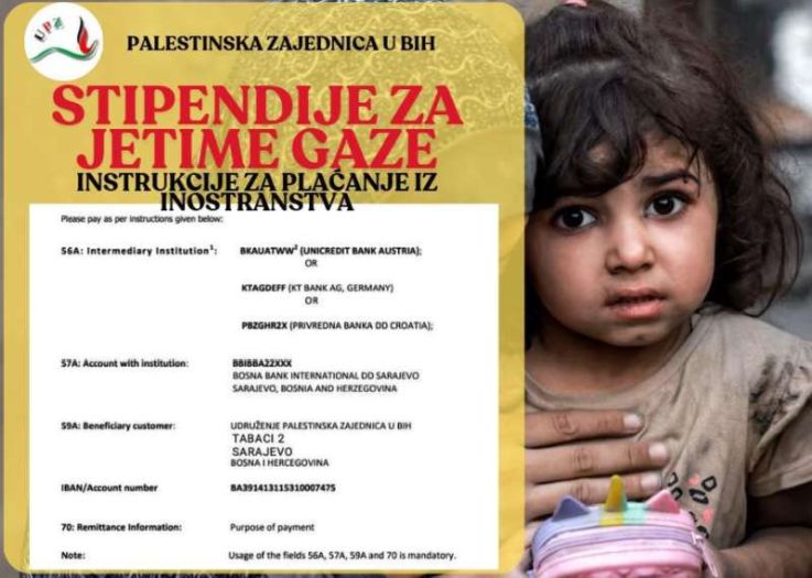 - Zahvaljujući donatorima, već je uplaćena prva tranša pomoći za 16 jetima u trajanju od šest mjeseci. Ovo je važan početak, ali potrebe su daleko veće. Zato pozivamo sve koji su u mogućnosti da se uključe i pomognu da nijedno dijete ne ostane zaboravljeno - navedeno je u saopćenju Palestinske zajednice u BiH.