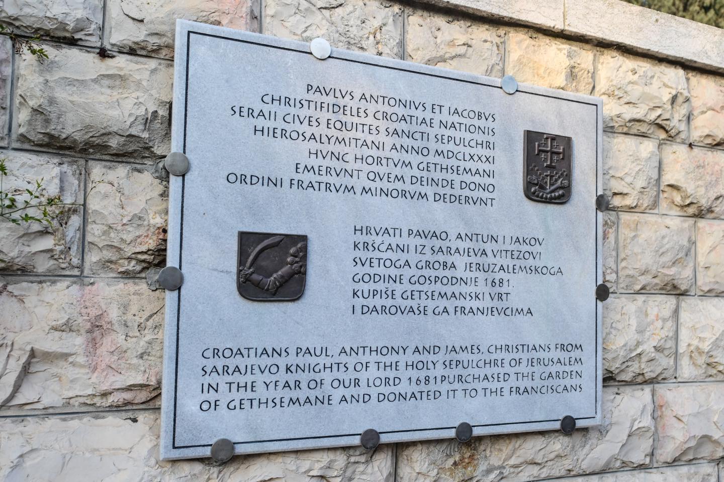"Hrvati Pavao Antun i Jakov, kršćani iz Sarajeva vitezovi Svetoga groba jeruzalemskog godine gospodnje 1681. kupiše Getsemanski vrt i darovaše ga franjevcima", ispisano je na spomen-ploči.