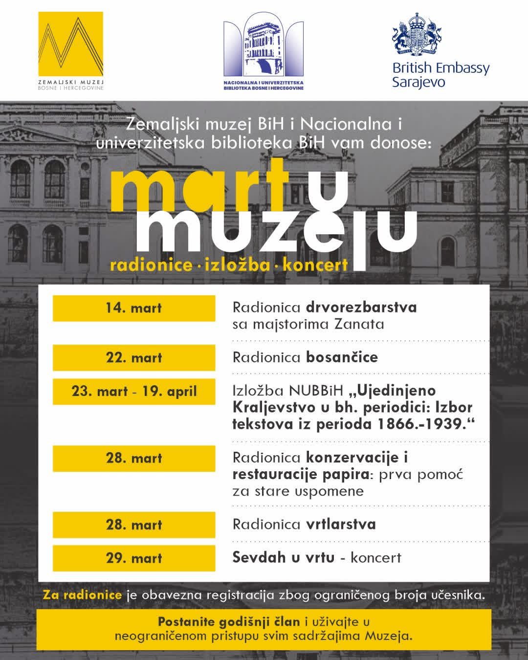 Od 23. marta do 19. aprila posjetioci će moći pogledati izložbu NUBBiH pod nazivom „Ujedinjeno Kraljevstvo u bh. periodici: Izbor tekstova iz perioda 1866–1939.“, koja donosi izbor tekstova iz historijske štampe o odnosima Bosne i Hercegovine i Ujedinjenog Kraljevstva.