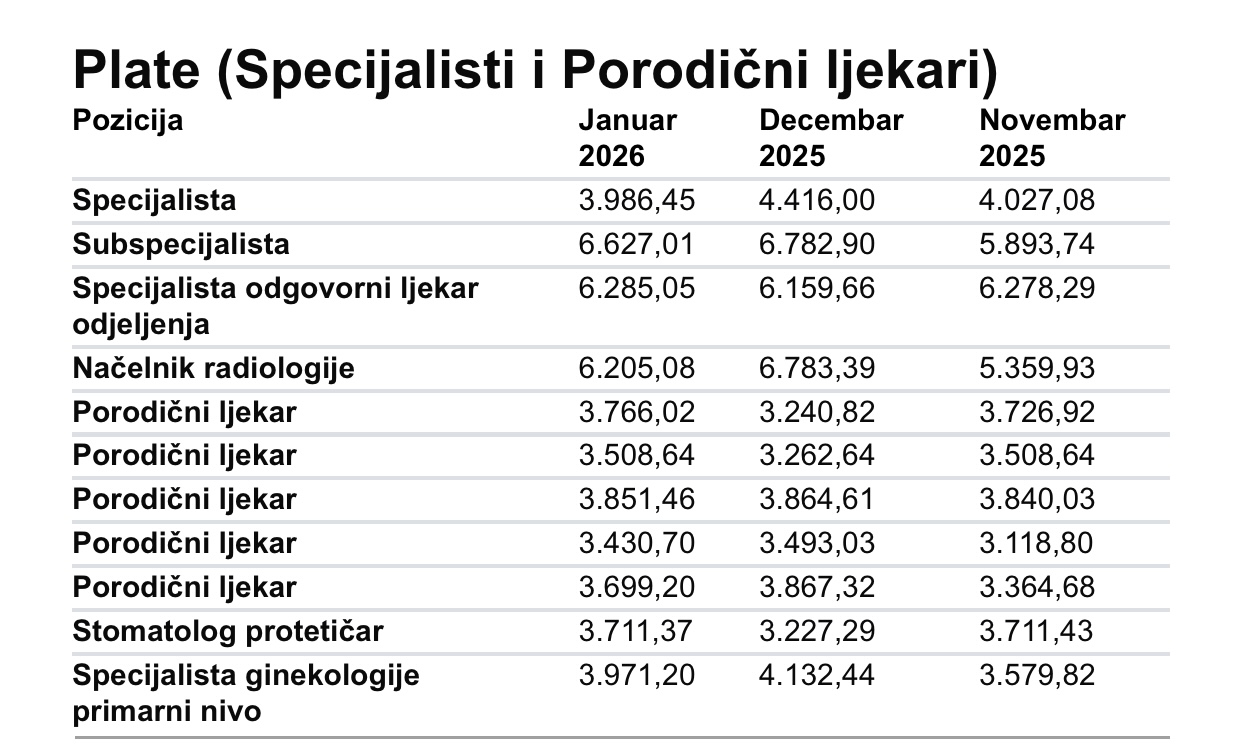Podaci pokazuju da su osnovne plate ljekara značajno rasle u proteklih pet godina. Osnovna plata specijaliste u 2021. godini iznosila je 2.209 KM, dok je u 2026. godini ona narasla na 3.210 KM. Uz redovne dodatke, ovaj iznos prosječno doseže 3.968 KM.