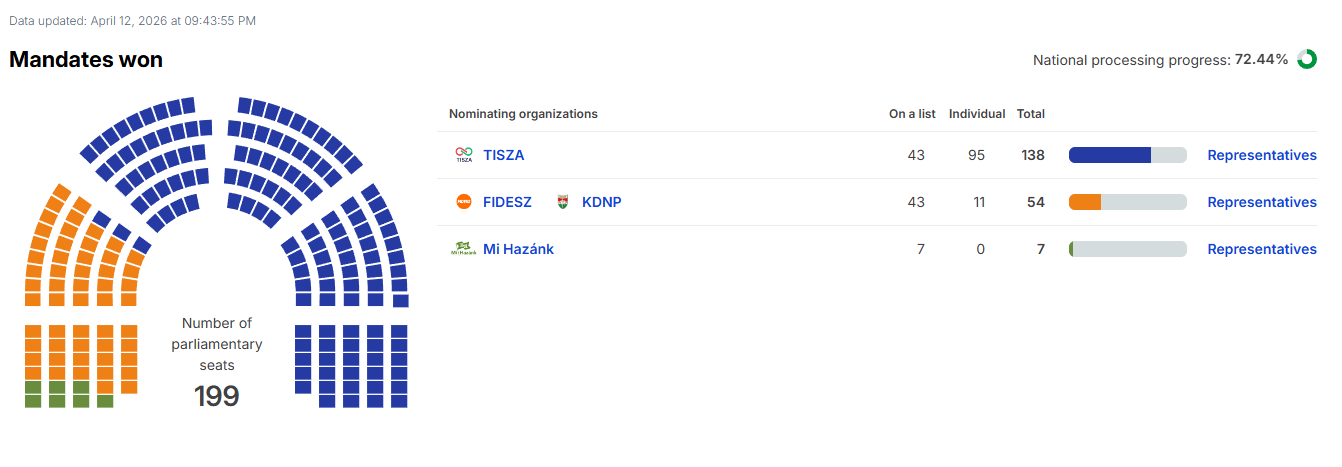 Tisza Petera Magyara vodi sa osvojenih 138 mandata (69,35%), dok je na drugom mjestu Fidesz, stranka Viktora Orbana sa 54 osvojena mandata (27,14%).
