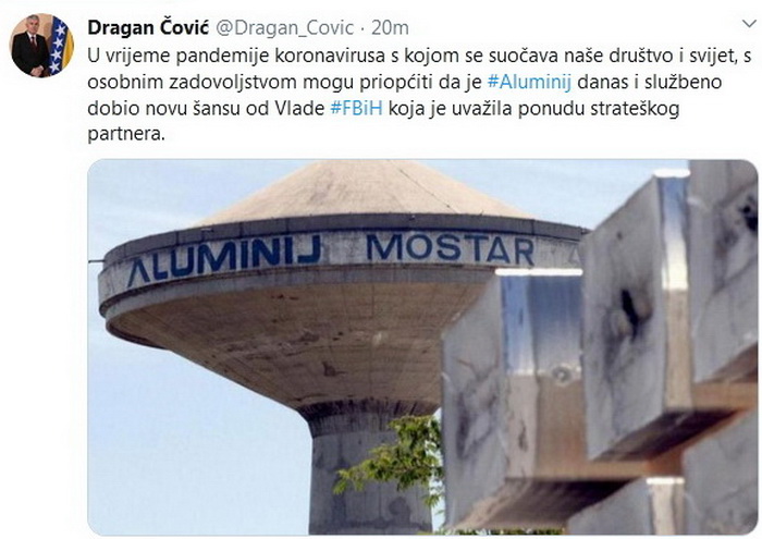 Čović je na svom Twitter nalogu napisao kako u vrijeme pandemije koronavirusa s kojom se suočava naše društvo i svijet, s osobnim zadovoljstvom može saopćiti da je Aluminij danas i službeno dobio novu šansu od Vlade Federacije BiH koja je uvažila ponudu strateškog partnera.