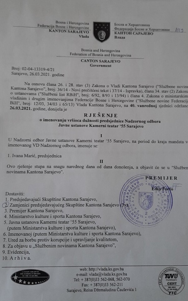 Vlada Kantona Sarajevo imenovala je političku komentatoricu Ivanu Marić za vršiteljicu dužnosti predsjednice Nadzornog odbora JU Kamerni teatar '55.