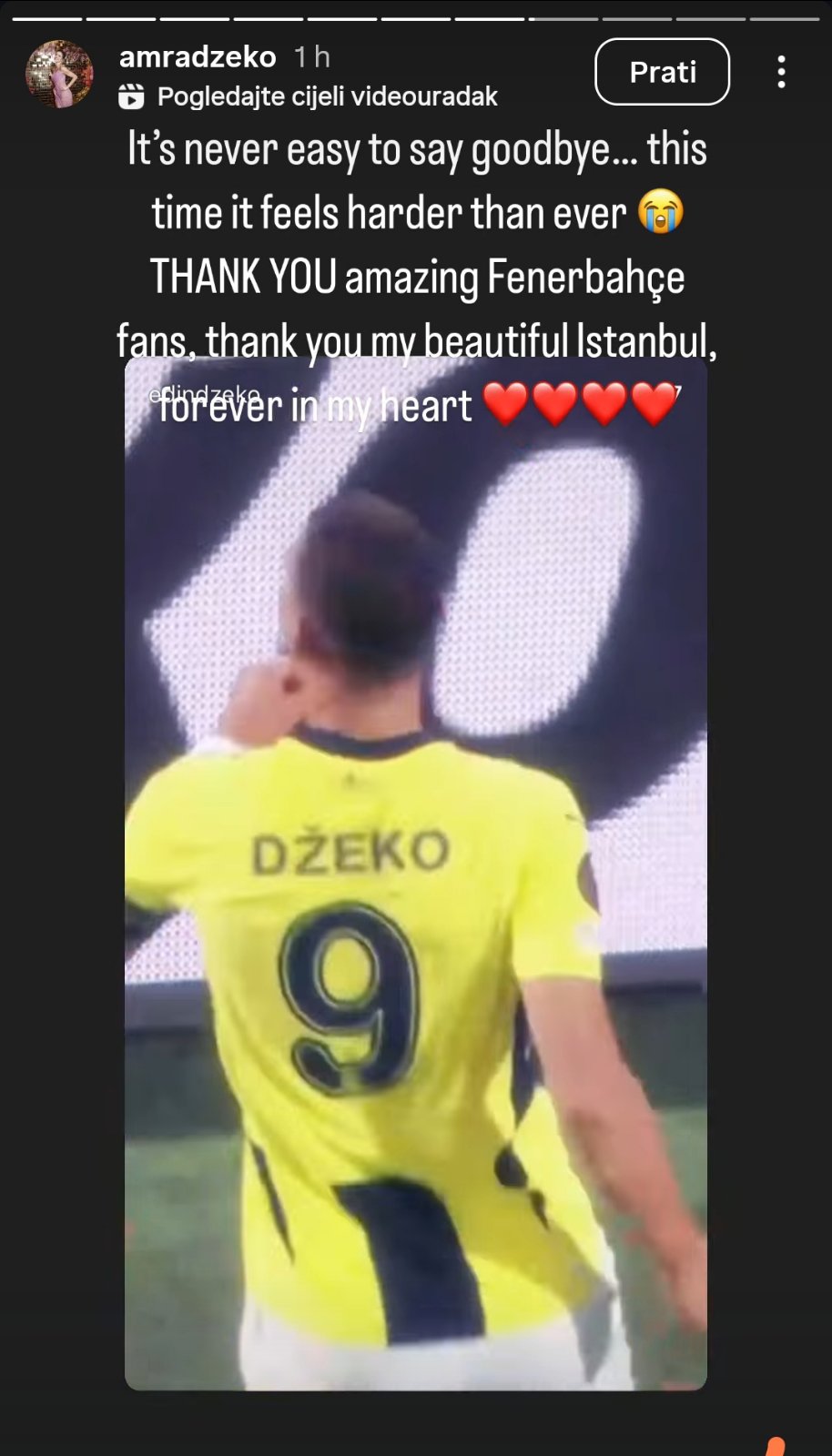 "Nikada nije lako reći zbogom... Ovaj put je to teže nego ikada. Hvala vam, divni fanovi Fenerbahčea, hvala ti, moj divni Istanbule. Zauvijek u mom srcu ", napisala je Amra uz snimak koji je ranije podijelio Edin.