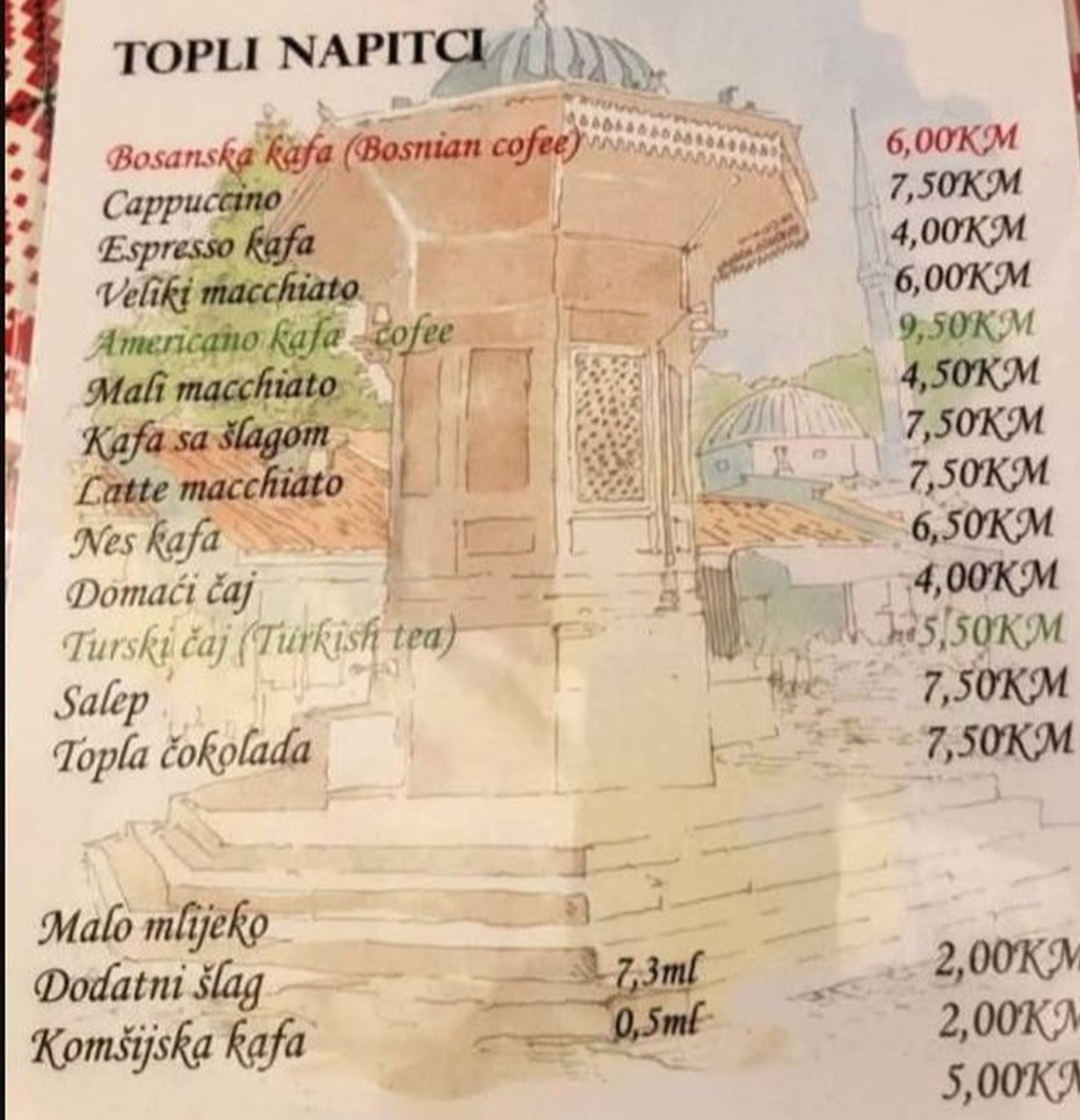 Bosanska kafa košta čak 6 KM, dok je espresso 4 KM. Toliko košta i domaći čaj i to je nešto najjeftinije što se ovdje može popiti.