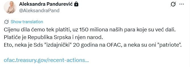 - Cijenu dila ćemo tek platiti, uz 150 miliona naših para koje su već dali. Platit će je RS i njen narod. Eto, neka je SDS "izdajnički" 20 godina na OFAC, a neka su oni "patriote" - navela je Pandurević.