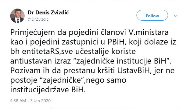 Primjećujem da pojedini članovi V.ministara kao i pojedini zastupnici u PBiH, koji dolaze iz bh entitetaRS, sve učestalije koriste antiustavan izraz “zajedničke institucije BiH”. Pozivam ih da prestanu kršiti UstavBiH, jer ne postoje “zajedničke”, nego samo institucije države BiH, napisao je Zvizdić.