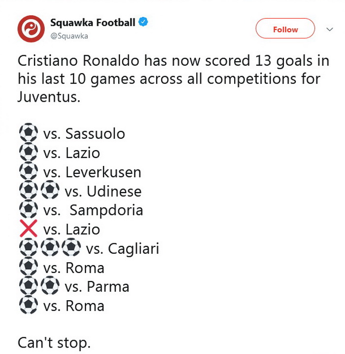Ronaldo je tako postigao pogodak u 15. takmičenju u svojoj karijeri, a u posljednjih deset utakmica 13 puta se upisivao u strijelce. Jedina utakmica u kojoj nije bio strijelac je ona protiv Lazija u Superkupu Italije.