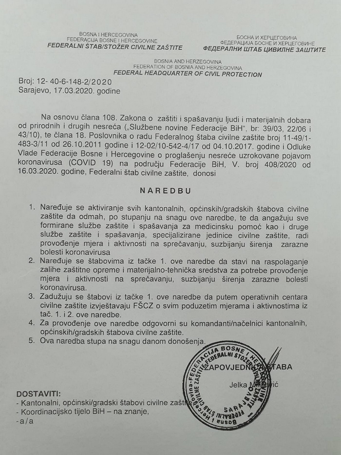Kako je pojasnio direktor Federalne uprave CZ Fahrudin Solak zabranjuje se svaki vid javnog okupljanja, rad kafića, barova, restorana, uslužnih objekata, te rad kulturnih institucija, poput kinosala, pozorišta, muzeja, galerija i slično.