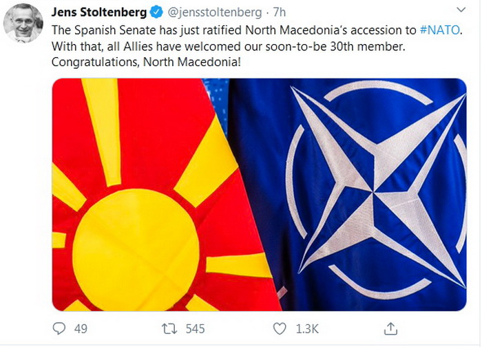 - Španski Senat upravo je ratificirao sporazum o ulasku Sjeverne Makedonije u NATO-u. Time su svi saveznici pozdravili prijem našeg uskoro 30. člana. Čestitke Sjevernoj Makedoniji - istaknuo je Stoltenberg.