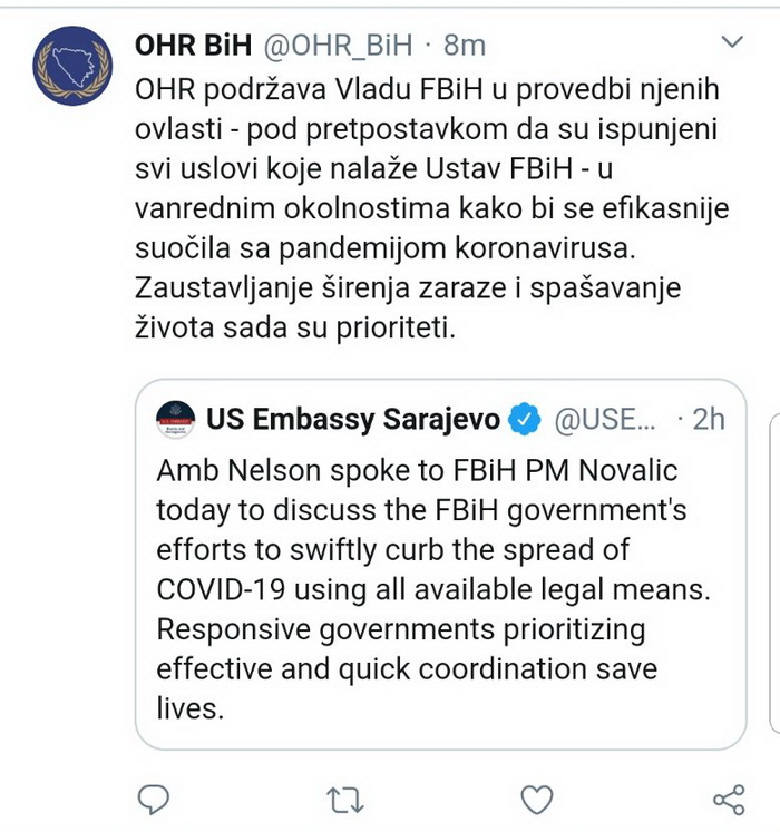 - OHR podržava Vladu FBiH u provedbi njenih ovlasti - pod pretpostavkom da su ispunjeni svi uslovi koje nalaže Ustav FBiH - u vanrednim okolnostima kako bi se efikasnije suočila sa pandemijom koronavirusa. Zaustavljanje širenja zaraze i spašavanje života sada su prioriteti, stoji u objavi na Twitter nalogu OHR-a kao reakcija na raniju objavu Ambasade SAD.