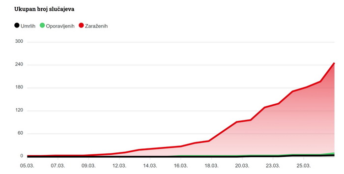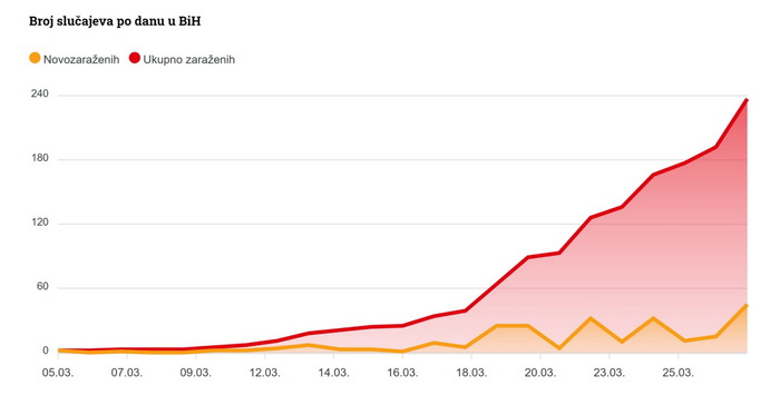 Četiri osobe su umrle, a pet osoba je izliječeno. Danas je u BiH zaraženo 45 osoba, od toga 34 u Republici Srpskoj i 11 u Federaciji BiH.
