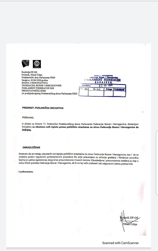 Zastupnik u Predstavničkom domu Parlamenta Federacije Bosne i Hercegovine uputio inicijativu da se do daljnjeg obustavi finansiranja političkih stranaka na nivou Federacije Bosne i Hercegovine.