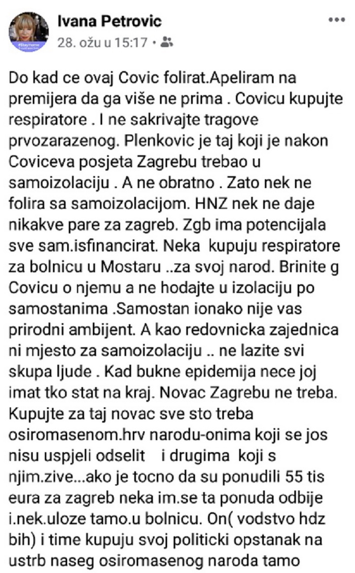 Na svome Facebook profilu još 28.03.2020.godine je napisala objavu kojom je Čovića “izbila iz cipela” i vrlo otvoreno ga pozvala da prestane sa svojim “manevrima” koji mu služe kao samoreklama.