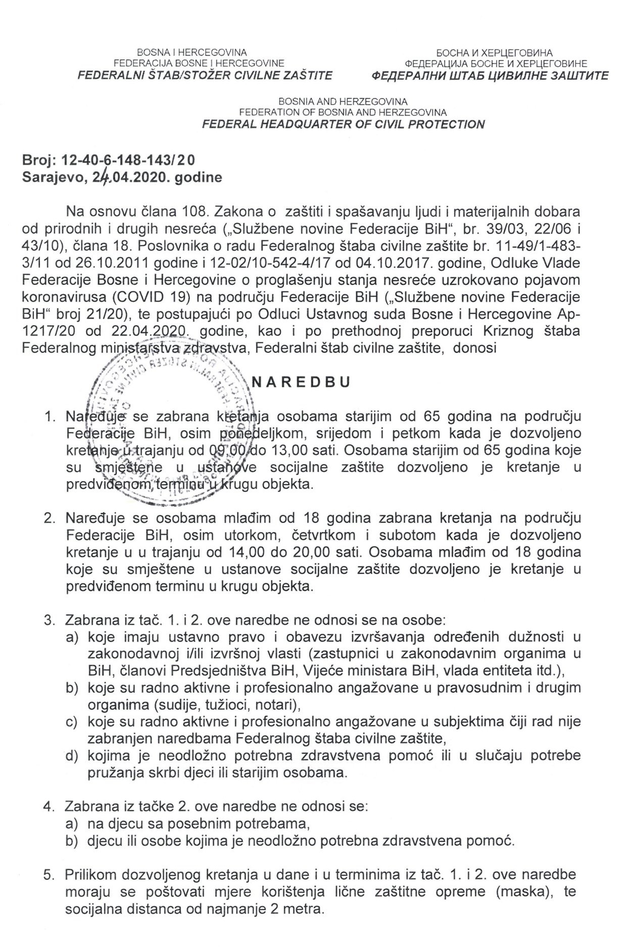 Također, naređuje se osobama mlađim od 18 godina zabrana kretanja na području FBiH, osim utorkom, četvrtkom i subotom, kada im je dozvoljeno kretanje u trajanju od 14 do 20 sati.