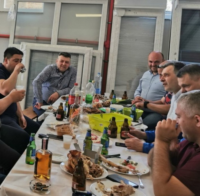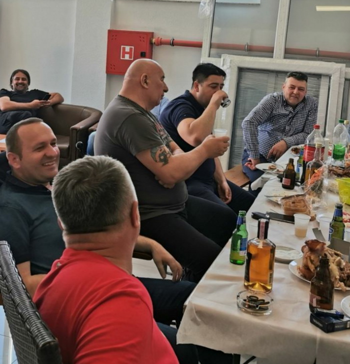 Fotografija je nastala u pogonu proizvodnje stolarije u Bijeljini koja je skoro pokrenuta. Druženje uz hranu i piće,bez poštovanja mjera okupljanja i distance,bez maski i rukavica je održan u popodnevnim časovima za vrijeme stroge zabrane okupljanja i u jeku pandemije korona virusa.