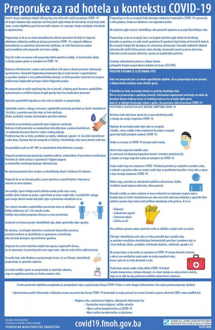 - Potrebno je redovno vršiti kontrolu i nadzor nad provedbom svih mjera i davati povratne informacije uposlenicima. Standardi higijenskog minimuma koji se inače koriste u ugostiteljstvu su posebno značajni u ovoj epidemiološkoj situaciji, te treba posebno insistirati na strogom pridržavanju higijenskih principa i dobre higijenske prakse. I dalje se ne preporučuje način smještaja kao što su hosteli, u kojima gosti borave u zajedničkim spavaonicama sa velikim brojem drugih gostiju koji nisu međusobno povezani. Upotreba zajedničkih kupatila za više soba se također ne preporučuje. Zajedničke toalete u sklopu restorana i zajedničkih prostorija potrebno je čistiti i dezinficirati što češće, a posebno površine koje se često dodiruju (šteke, prekidači, slavine, horizontalne površine stolova)- navodi se u preporukama.