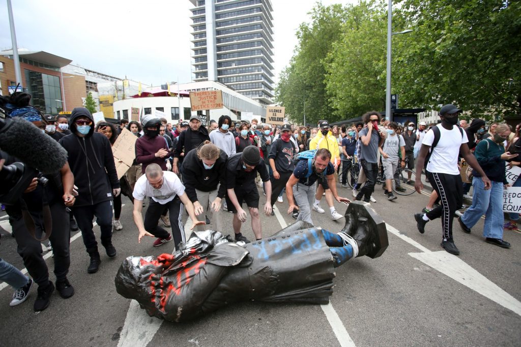Spomenik je srušen tokom drugog dana antirasističkih protesta koji se događaju širom Velike Britanije, a u Londonu je došlo i do sukoba sa policijom. Nakon što su demonstranti srušili statuu, jedan od njih je skočio na kip i gazio ga po vratu kako bi aludirao na smrt Afroamerikanca Džordža Flojda u Mineapolisu, prenosi nova.rs.