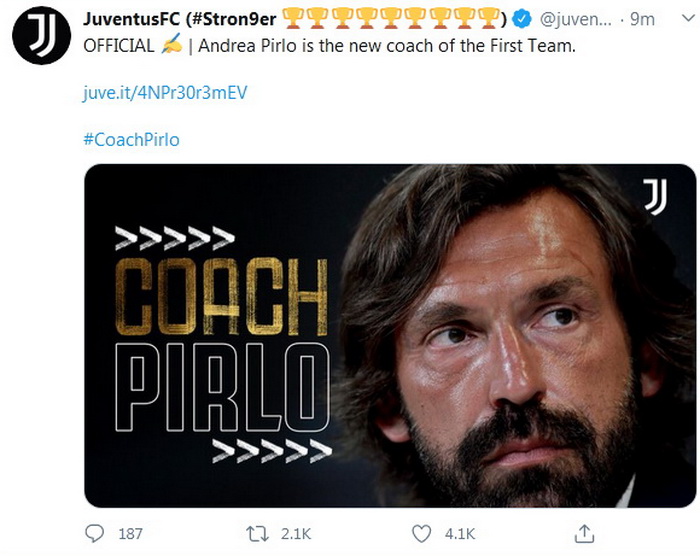 Današnji izbor zasnovan je na uvjerenju da Pirlo ima ono što je potrebno da od svog debija na klupi vodi stručnim i talentovanim sastavom za ostvarivanje novih uspjeha, navodi se na službenoj stranici Stare dame.