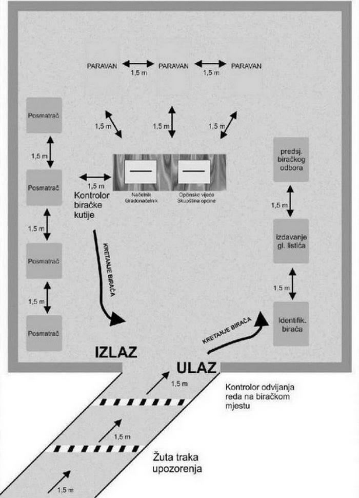 Neophodno je, poručuju iz CIK-a, postaviti upozorenja o pridržavanju opštih mjera zdravstvene zaštite, obilježiti prilaz biračkom mjestu, odnosno hodnik ispred ulaza na biračkom mjestu žutom samoljepljivom trakom u razmaku od 1,5 metara i po mogućnosti da se birači usmjeravaju da ulaze na jedna vrata, a da izlaze na druga - u slučaju da to nije moguće, vrata moraju ostati otvorena da bi se izbjegao fizički kontakt.