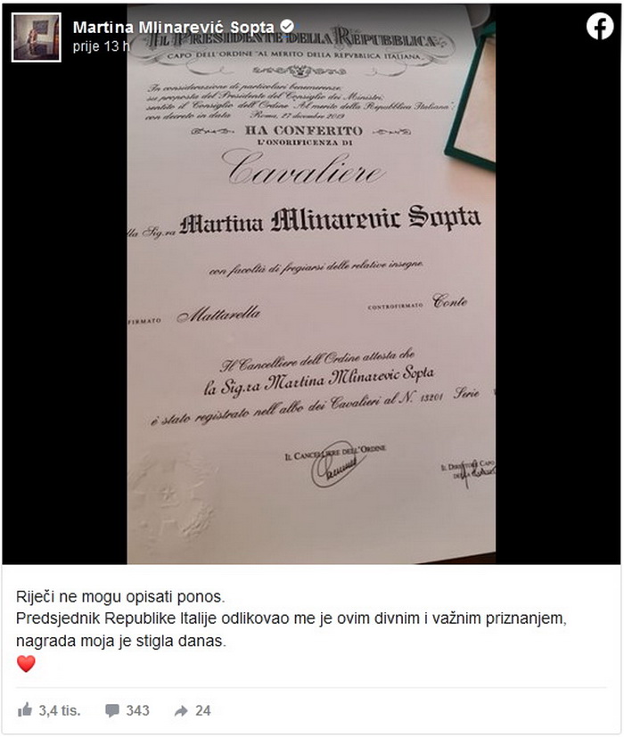 Ambasadorica Bosne i Hercegovine u Češkoj, ugledna književnica, pjesnikinja i kolumnistica Martina Mlinarević-Sopta dobila je visoko odlikovanje predsjednika Italije Serđa Matarele (Sergio Mattarella).