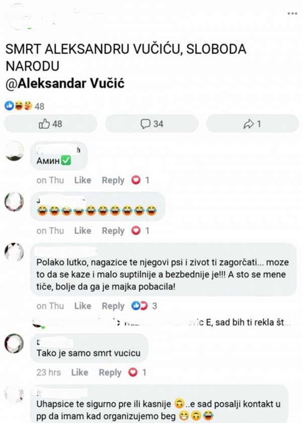 Na društvenoj mreži Facebook pojavile su se prijetnje smrću predsjedniku Srbije Aleksandru Vučiću.