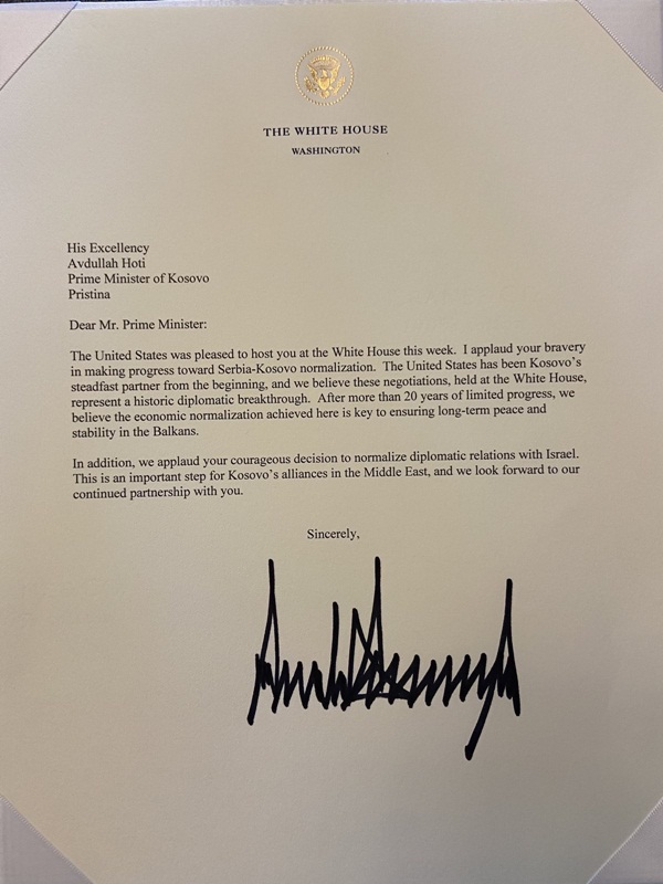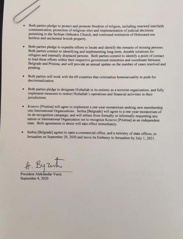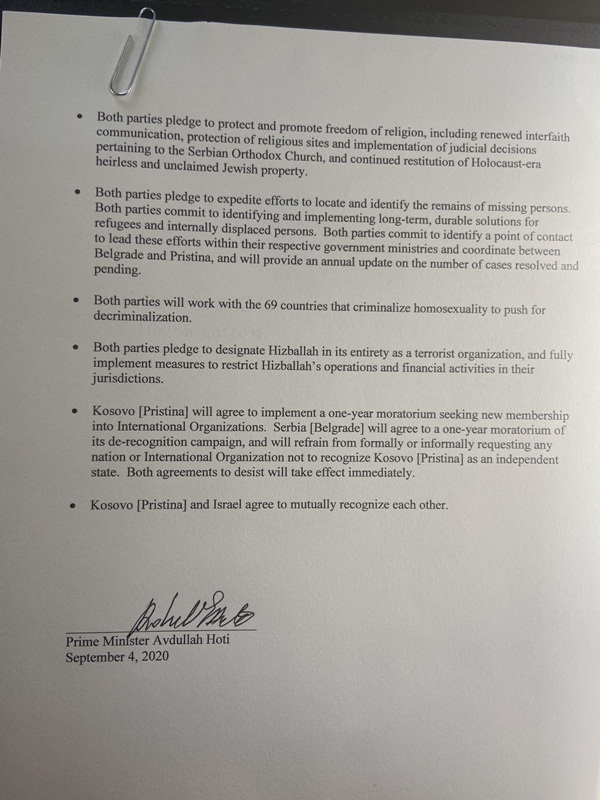 Predviđeno je i međusobno priznanje Kosova i Izraela i uspostava diplomatskih odnosa.