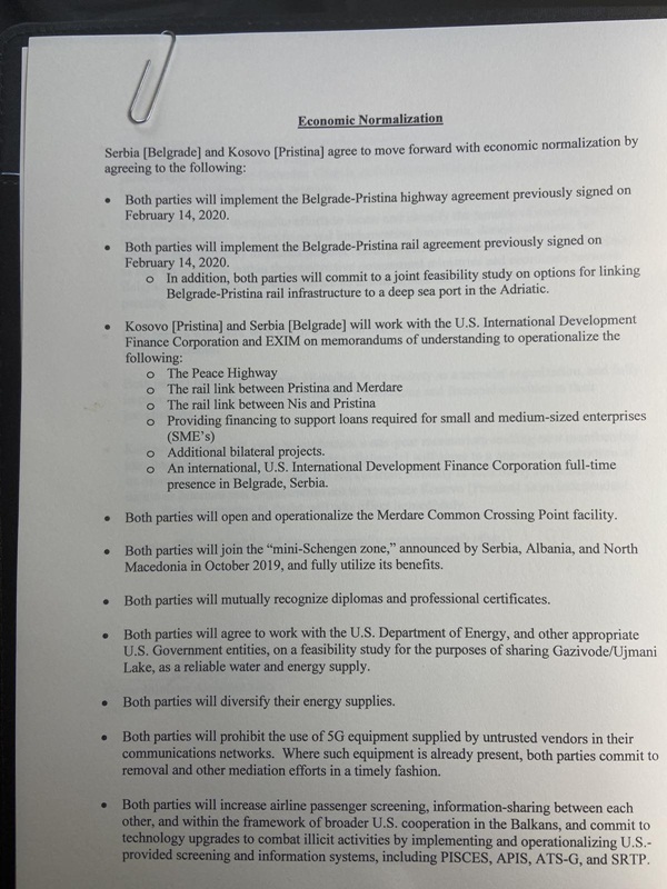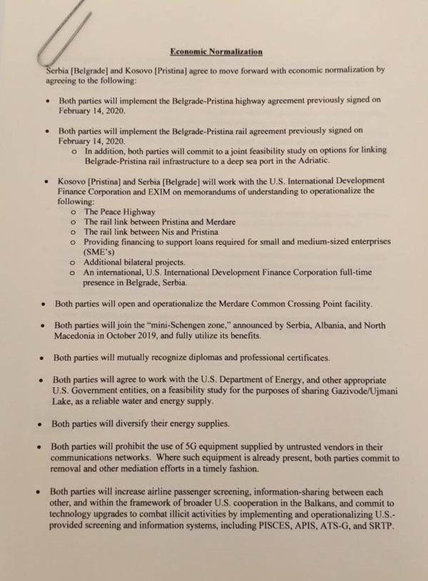 Prema potpisanom sporazumu, Priština će pristupiti inicijativi Mini šengen, bez odlaganja će početi izgradnja mreža novih puteva i pruga koje će bolje povezati region, a u Beogradu će biti otvorena kancelarija Američkog fonda za razvoj.
