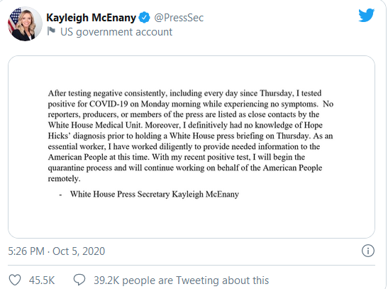 Vijest o McEnanyevoj uslijedila je nekoliko dana nakon što je predsjednik SAD Donald Trump bio pozitivan na testu za virus korona, kao i pomoćnik američkog predsjednika Hope Hicks.