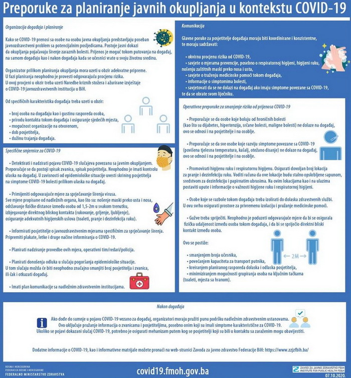 vrate u svoju životnu sredinu. Organizator prilikom planiranja okupljanja mora uzeti u obzir adekvatne pripreme. U fazi planiranja neophodno je provesti odgovarajuću procjenu rizika. U ovoj procjeni u obzir treba uzeti Naredbe kriznih stožera i ažurirane izvještaje o koronavirusu javnozdravstvenih institucija u BiH", naveli su iz ZZJZFBiH.