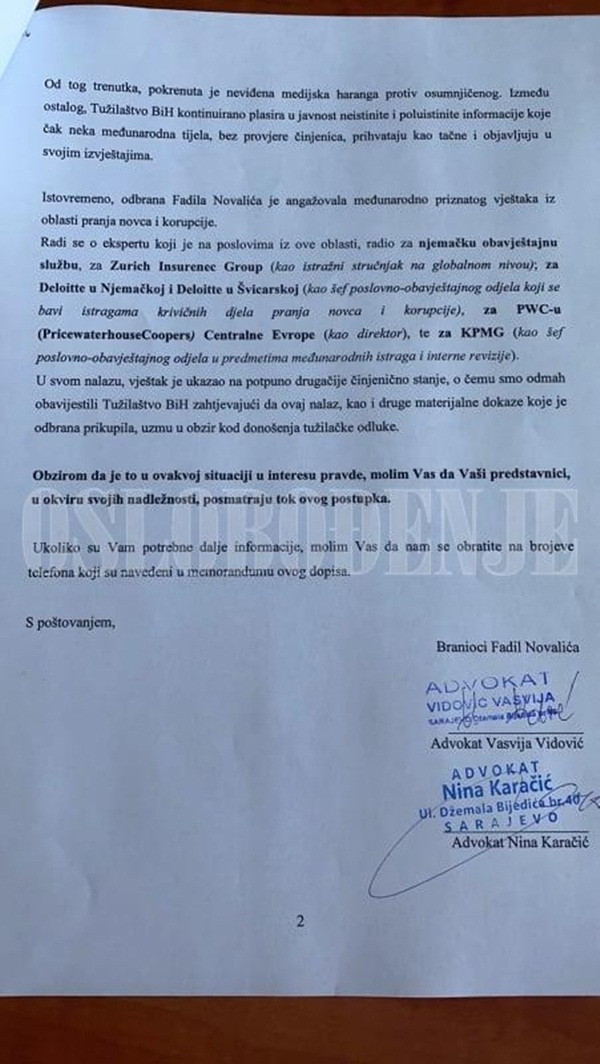 -Tačno je da smo angažovali međunarodnog vještaka. U javnosti je stvorena ogromna hajka koja se odrazila i na vještake koji inače rade na tom slučaju, odrazilo se i na Sud BiH. Stvorena je slika o krivnji unaprijed, da je izvršeno krivično djelo. Nismo željeli da bilo ko bude pod utiskom takve situacije i izvještavanja medija. Angažovali smo neutralnog i vrlo uglednog međunarodnog eksperta, jednog od najugledijih u svijetu iz oblasti pranja novca i korupcije, pojasnila je za portal Oslobođenje.