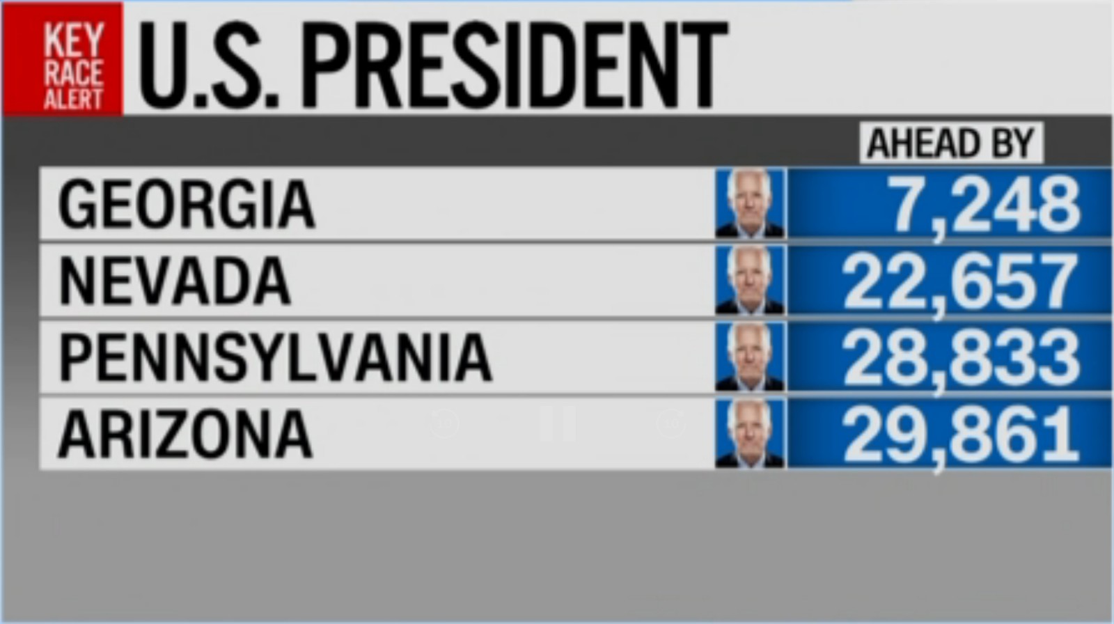 10.59 - Biden i dalje sigurno vodi u četiri ključne savezne države, i to: u Georgiji sa 7.248, u Nevadi sa 22.657, u Pennsylvaniji sa 28.833 i u Arizoni sa 29.861 glasom.