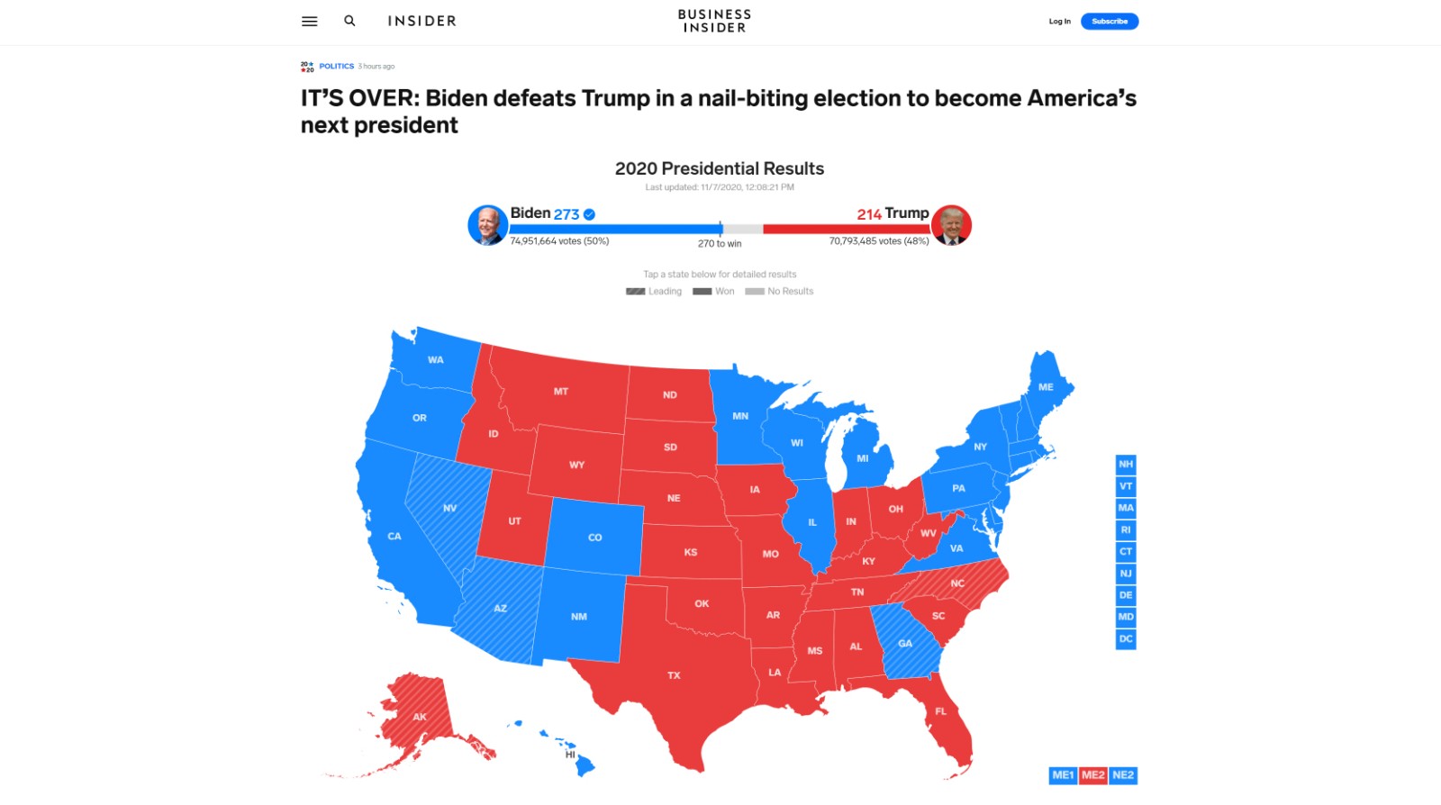 Na interaktivnoj mapi Business Insidera, pobjedu je u Pennsylvaniji odnio Biden te na taj način stigao do brojka od 273 elektorskih glasova. 10:59 - Republikanac McConnell: Naravno da će biti miran prijenos vlasti