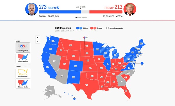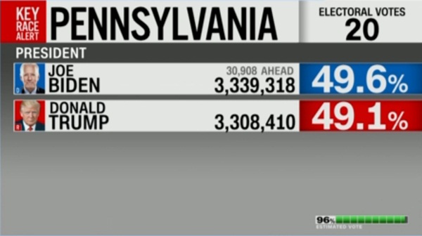 Prema projekcijama CNN-a, Bidenu je pobjedu donijela savezna država Pennsylvanija, u kojoj je osvojio dodatnih 20 elektorskih glasova. Samim tim, Biden je osigurao minimum 273 elektorska glasa, što mu je sasvim dovoljno da postane 46. predsjednik SAD.