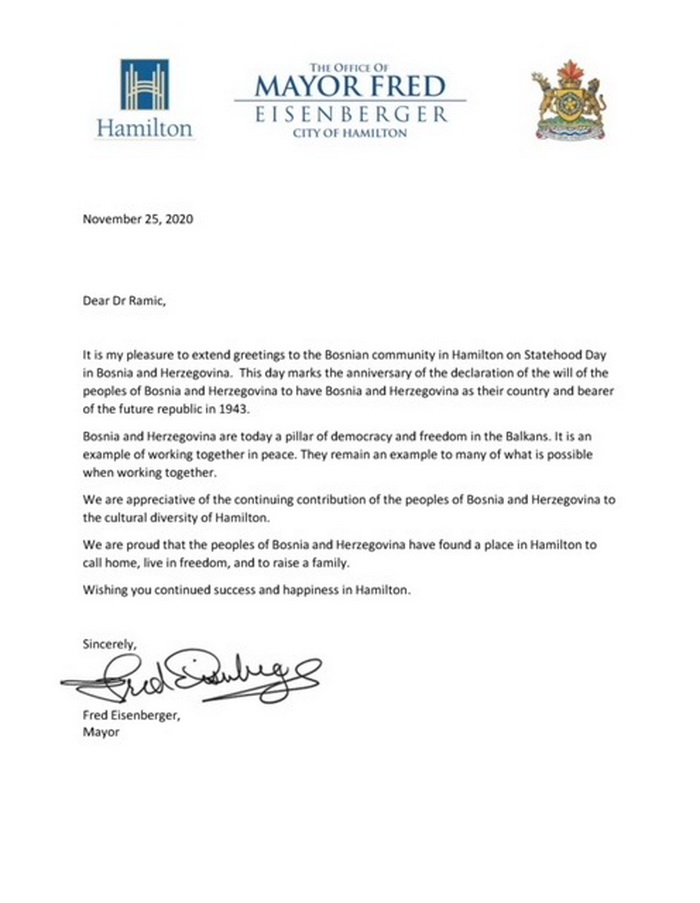 Tradicionalno gradonačelnik Hamiltona čestita Dan državnosti BiH. U ovogodišnjoj čestitki gradonačelnik je između ostalog napisao: "Zadovoljstvo mi je pozdraviti bosansku zajednicu u Hamiltonu na Dan državnosti u BiH. Na današnji dan obilježava se godišnjica proglašenja volje naroda BiH da ona bude država. BiH je danas stub demokratije i slobode na Balkanu. To je primjer zajedničkog rada u miru. Mnogima ostaje primjer onoga što je moguće kada se radi zajedno. Zahvalni smo na kontinuiranom doprinosu građana BiH kulturnoj raznolikosti Hamiltona. Ponosni smo što su građani BiH u Hamiltonu pronašli mjesto za svoj poziv, svoju kuću, život u slobodi i podizanje svoje porodice".