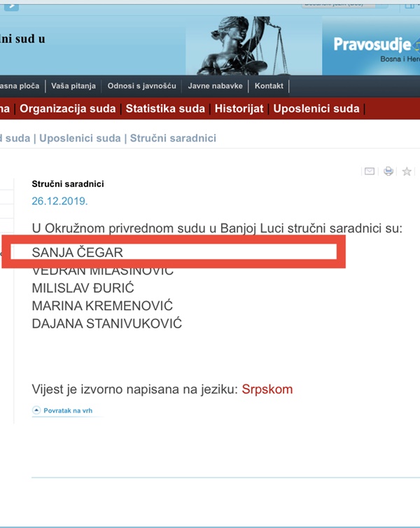 Milijana Buha postala je članica VSTV-a u oktobru 2016. godine, a izabrana je u Predstavničkom domu Parlamentarne skupštine BiH. Iako je, na početku, smatrana kadrom SDS-a, ona vrlo brzo “mijenja” stranu te postaje jedna od najbitnijih saradnica predsjednika VSTV-a Milana Tegeltije kojem pruža podršku prilikom donošenja svih bitnih odluka. Njena sestra Sanja Čegar je pravnica koja je trenutno stručna saradnica u Okružnom privrednom sudu u Banja Luci. Novinari Istrage jutros su pokušali stupiti s njom u kontakt, ali su nam rekli da trenutno ne radi. Upravo Milan Tegeltija u razgovoru sa njenom sestrom priznaje da je razgovarao sa Sanjom i da će njeno imenovanje biti završeno. Upravo su imenovanja na ovaj način jedan od glavnih problema bh. pravosuđa, o čemu je u svom Godišnjem izvještaju pisao i OSCE BiH.