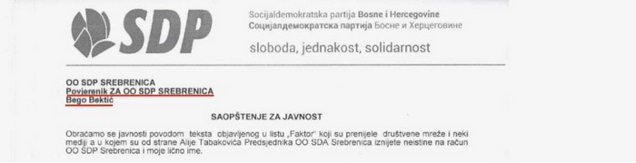 Naime, u Srebrenici je djelovalo Povjereništvo SDP-a na čelu sa povjerenikom Begom Bektićem, a ne "Općinska organizacija" kao što piše u današnjem saopćenju SDP-a, prenose Vijesti.ba.