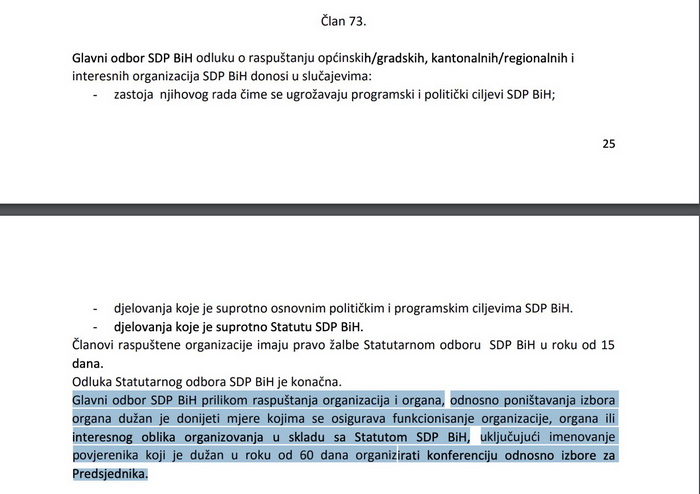 "Glavni odbor SDP BiH prilikom raspuštanja organizacija i organa, odnosno poništavanja izbora organa dužan je donijeti mjere kojima se osigurava funkcionisanje organizacije, organa ili interesnog oblika organizovanja u skladu sa Statutom SDP BiH, uključujući IMENOVANJE POVJERENIKA."