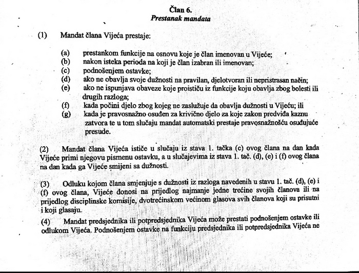 “Odluku kojom člana smjenjuje s dužnosti iz razloga navedenih u stavu 1. tač. (d), (e) i (f) ovog člana, Vijeće donosi na prijedlog najmanje jedne trećine svojih članova ili na prijedlog disciplinske komisije, dvotrećinskom većinom glasova svih članova koji su prisutni i koji glasaju”, navedno je u Zakonu o VSTV-u.