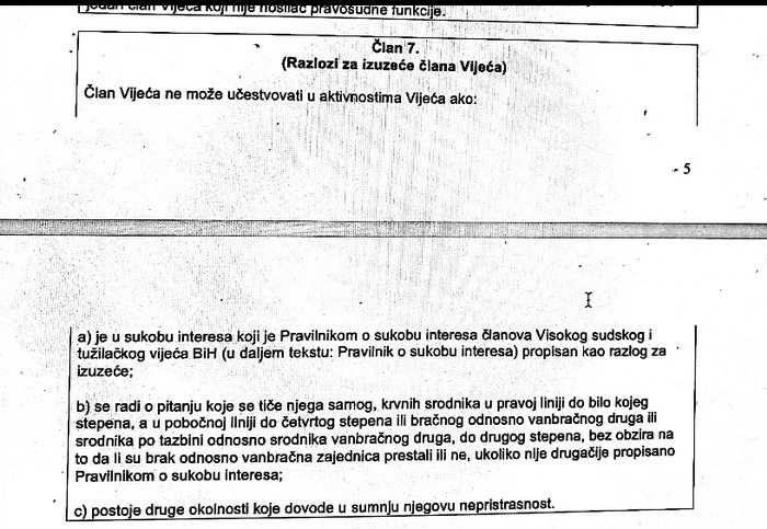 “Član Vijeća ne može učestvovati u aktivnostima Vijeća ako se radi o pitanju koje se tiče njega samog, krvnih srodnika u pravoj liniji do bilo kojeg stepena, a u pobočnoj liniji do četvrtog stepena ili bračnog odnosno vanbračnog druga ili srodnika po tazbini odnosno srodnika vanbračnog druga, do drugog stepena, bez obzira na to da li su brak odnosno vanbračna zajednica prestali ili ne, ukoliko nije drugačije propisano Pravilnikom o sukobu interesa”, navedeno je u Poslovniku o radu VSTV-a.