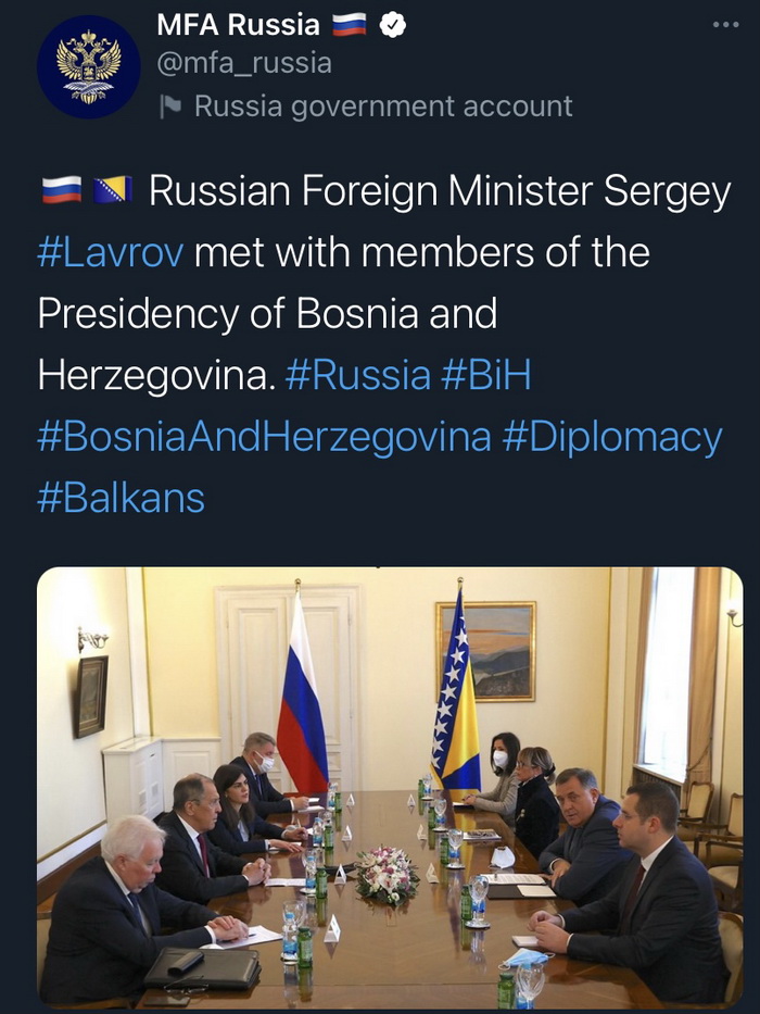 Podsjećamo, Lavrov se sastao samo s jednim od trojice članova Predsjedništva BiH Miloradom Dodikom, dok su Željko Komšić i Šefik Džaferović odbili sastanak.