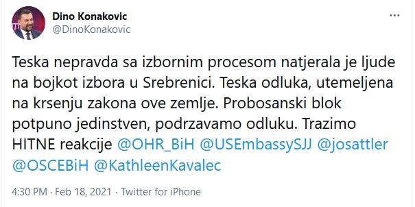 "Teška nepravda sa izbornim procesom natjerala je ljude na bojkot izbora u Srebrenici. Teška odluka, utemeljena na kršenju zakona ove zemlje. Probosanski blok potpuno jedinstven, podržavamo odluku. Tražimo HITNE reakcije OHR-a, Američke ambasade, Johanna Sattlera, OSCE-a BiH, Kathleen Kavalec", tvitao je Konaković.