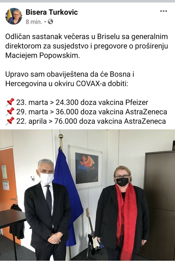 - Odličan sastanak večeras u Briselu sa generalnim direktorom za susjedstvo i pregovore o proširenju Maciejem Popowskim. Upravo sam obaviještena da će Bosna i Hercegovina u okviru COVAX-a dobiti: