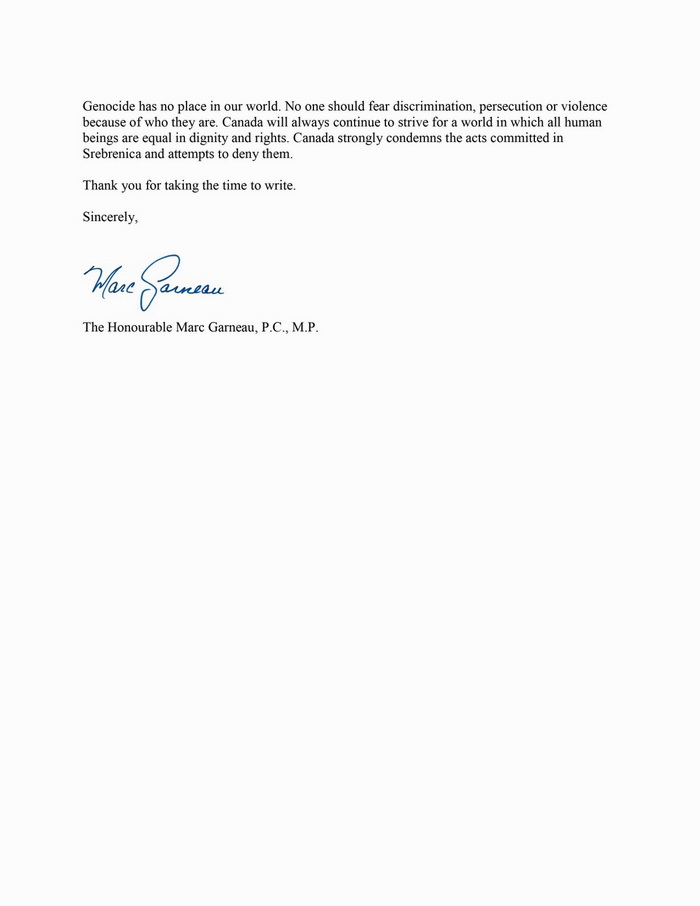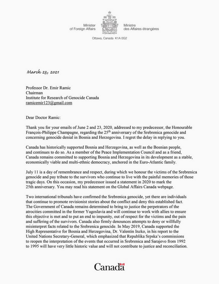 U situaciji kada se kontinuirano napada na suverenitet, teritorijalni integritet i nezavisnost BiH, u situaciji kada se negira genocid, veličaju osuđeni ratni zločinci i pokušava revizija sudskih i historijskih činjenica, te u situaciji kada ambasador BiH u Kanadi negira genocid u Srebrenici i diplomatski ne predstavlja svoju državu, odgovor kanadskog ministra vanjskih poslova je značajan jer potvrđuje: kanadskog podržavanje države BiH, njenog suvereniteta, nezavisnosti i teritorijalnog integriteta, njenog evroatlanskog puta, pravosnažnih presuda međunarodnih sudova o genocidu u Srebrenici, odbacivanja i osude negiranje genocida u Srebrenici i pokušaje revizije sudskih i historijskih činjenica o genocidu u Srebrenici, podržavanja Visokog predstavnika u osudi formiranja komisija za navodnu reviziju događaja u Srebrenici i Sarajevu.