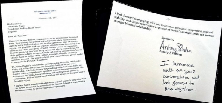 Blinken je u pismu Vučiću ponovio dobro poznate stavove Vašingtona - da dijele viziju stabilne, prosperitetne i demokratske Srbije na putu ka članstvu u EU, kao i da je cilj SAD da vide postignut sveobuhvatan sporazum između "Srbije i Kosova fokusiran na uzajamno priznavanje".
