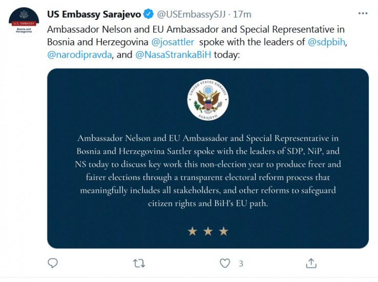 - Ambasador Nelson i ambasador EU i specijalni predstavnik u Bosni i Hercegovini Johann Sattler razgovarali su danas s liderima SDP BiH, Naroda i Pravde i Naše Stranke o ključnom radu u ovoj neizbornoj godini na stvaranju slobodnijih i poštenijih izbora putem transparentne izborne reforme, proces koji na značajan način uključuje sve sudionike i druge reforme za zaštitu prava građana i put BiH ka EU - objavila je Američka ambasada na svom Twitter nalogu.